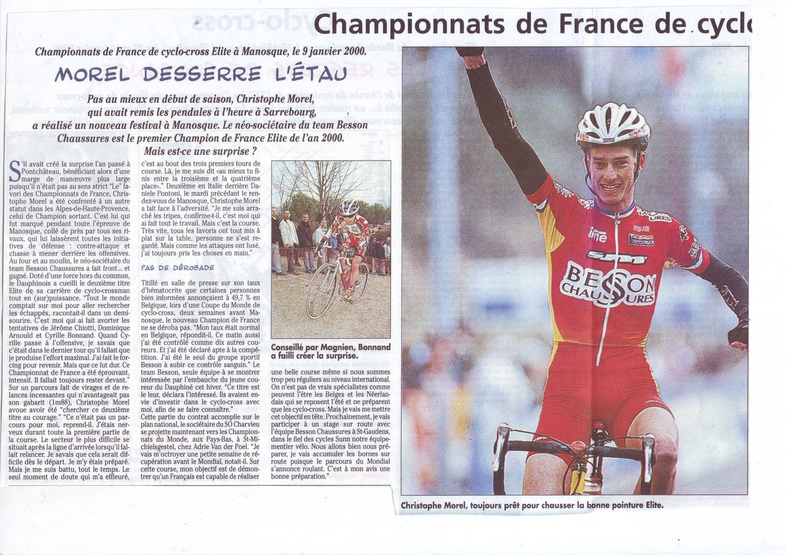 En Elites, Christophe Morel, l'une des recrues du Team Besson Chaussures pour la saison 2000, tenant du titre Elites depuis sa victoire à Pontchâteau (44) en janvier 1999 a lui aussi parfaitement maîtrisé son sujet et ses adversaires avant de multiplier les attaques dans un final étourdissant.