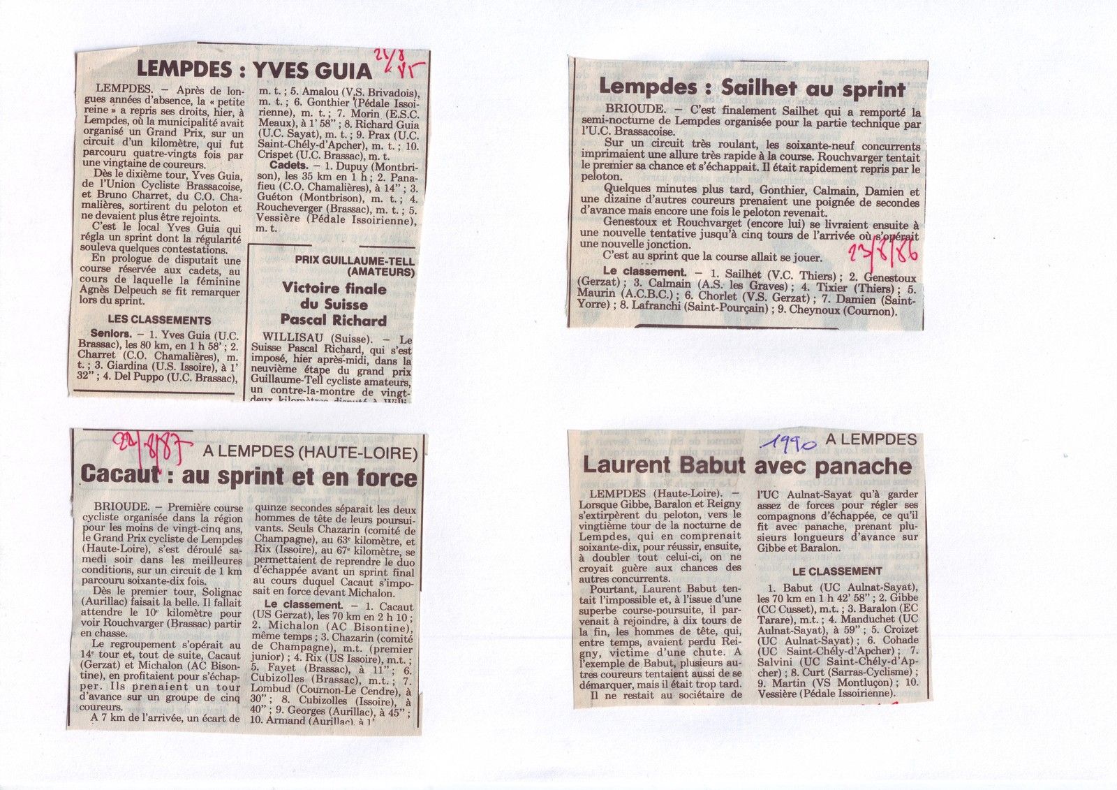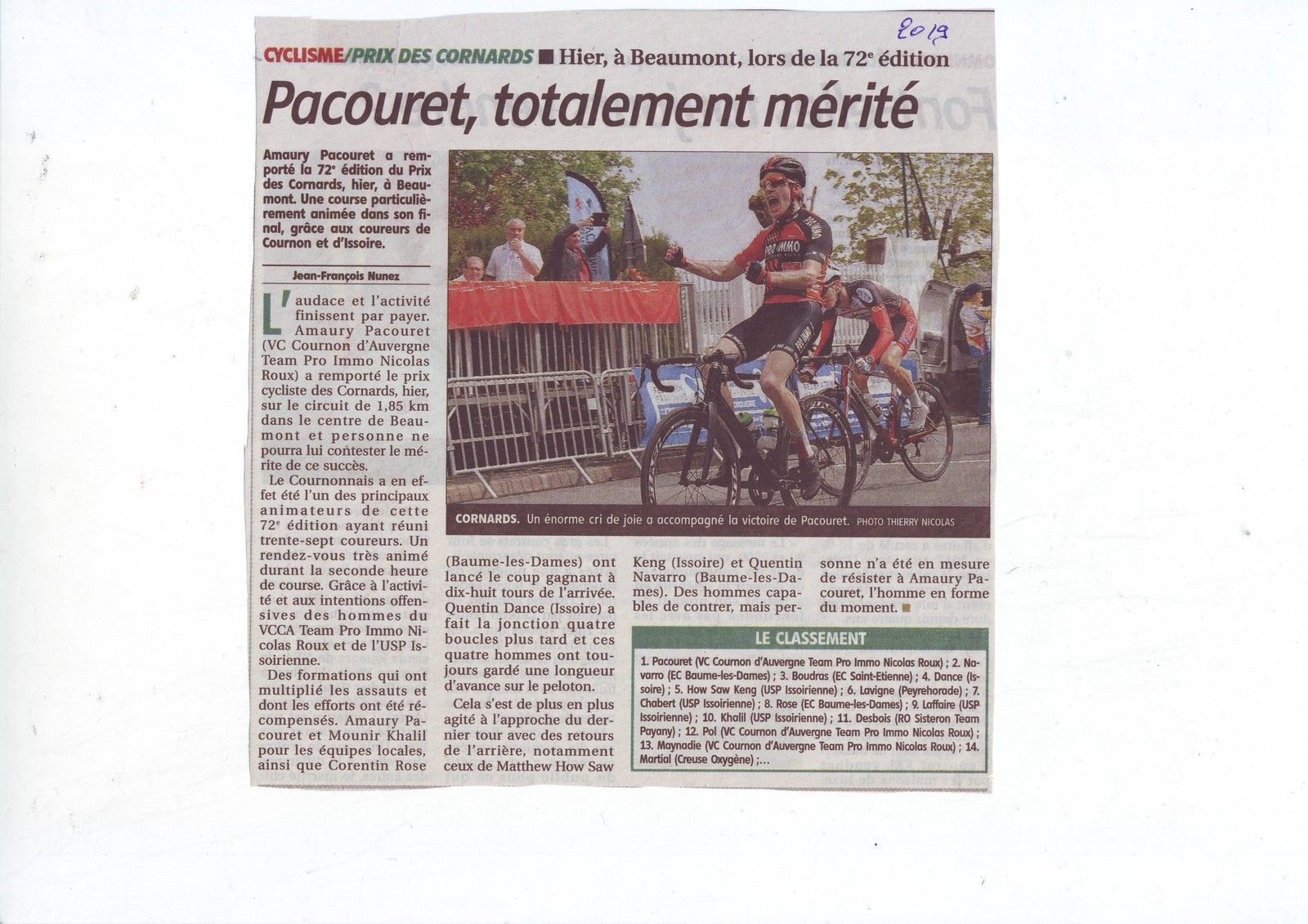Créé en 1946 sur une initiative de Marcel Portier, maire de Beaumont, le populaire Grand Prix de Beaumont fut longtemps considéré comme un incontournable rendez-vous de début de saison. Couru le matin du lundi de Pâques, le Grand Prix des Cornards tire son nom d’une délicieuse brioche locale, traditionnellement accompagnée d’un vin rosé du pays. Cette épreuve donne toujours lieu à des confrontations régionales de qualité même si son prestige s’est sérieusement terni depuis une quinzaine d’années. Son palmarès est incomparable et le rappeler permettra à beaucoup de remonter l'horloge aux souvenirs. A une époque ou les courses cyclistes ont pratiquement disparues des festivités du week-end Pascal et au moment où la lutte contre l’alcool au volant fait la une des journaux, il est bon de rappeler une anecdote concernant les Prix de Beaumont et de Bellerive. A la fin des années 50, notamment en 1958 et 1959, le succès populaire et festif de la course de Beaumont provoquait quelques débordements bien sympathiques, mais aussi très dangereux. Durant ces deux années, un service de bus était assuré entre Beaumont et Bellerive…avec retour assuré en toute tranquillité. En 1959, trois bus avaient été nécessaires pour transporter les supporters et quatre coureurs avaient profité de ce service exceptionnel pour aller disputer le Grand Prix de Bellerive.